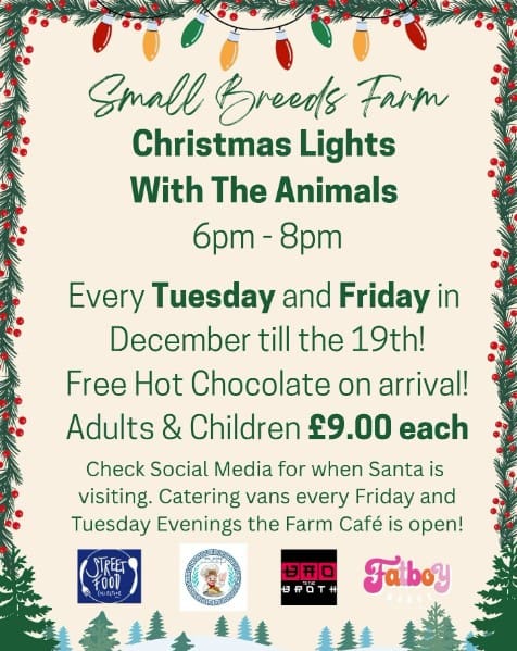 Wrap up warm and take in the lights and the animals, On Tuesdays the Tearoom will be open for hot food and festive treats and on Friday’s, there will be food catering vans on site.