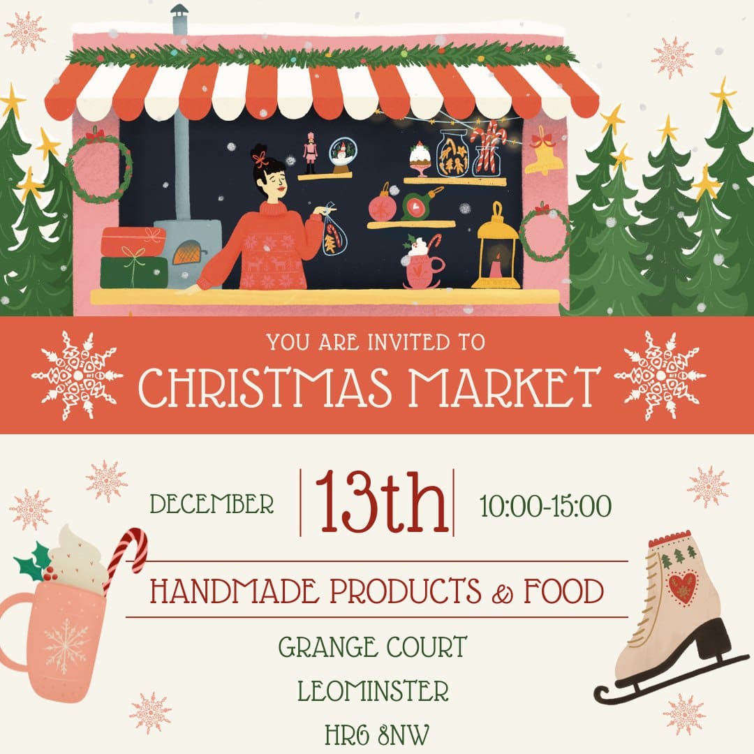 Christmas Market at Grange Court Santa’s Grotto, Mulled Wine, Mince pies and so much more….. 13Dec 2510:00AM to 3:00PM Fees & Tickets Free Event More Information Event Location Grange court Pinsley Road Leominster HR6 8NWOrganiser: Grange Court Location Map